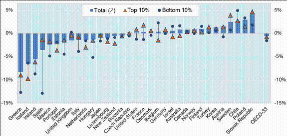 Inequality is behaving in an “amazing” way: Hardest the hit largest the increase. “The largest increases”, according to the OECD, “occurred in those countries hit hardest by the crisis: Spain , Ireland , Greece , Estonia and Iceland ”. France and Slovenia have the same experience. “In Spain and Greece , inequality of market income widened considerably in the aftermath of the crisis, and kept increasing more recently as the crisis persisted: compared to 2010, it increased by another 1.5 and 3 percentage points, respectively, in 2011. Market income inequality also increased by more than 1 percentage point in 2011 in Germany , Luxembourg and Portugal , compared to 2010.” (ibid.)